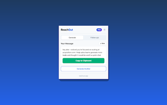 ReachOut - AI LinkedIn Message Generator เป็นส่วนขยายของ Chrome ที่ออกแบบมาเพื่อปรับปรุงประสบการณ์การส่งข้อความใน LinkedIn ของคุณโดยการสร้างข้อความการเข้าถึงที่ปรับให้เหมาะสมได้อย่างง่ายดาย โดยการวิเคราะห์โปรไฟล์ LinkedIn มันช่วยให้ผู้ใช้สามารถสร้างข้อความที่น่าสนใจในไม่กี่วินาที ทำให้การสื่อสารทั่วไปกลายเป็นเรื่องในอดีต ขั้นตอนนั้นง่ายมาก: ไปที่โปรไฟล์ LinkedIn คลิกที่ส่วนขยาย ใส่ข้อความนำเสนอของคุณ และรับข้อความที่สร้างโดย AI ที่ปรับให้เหมาะกับผู้รับ